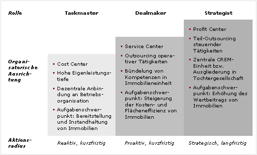 Das Ziel, die Immo­bilie als strate­gische Res­source zu nutzen, erfordert effi­ziente Steue­rungsmöglich­keiten und -instr­umente. Aus diesem Grund haben viele Unter­nehmen ihre immo­bilien­spezifi­schen Funk­tionen in einer zentralen Organi­sations­einheit gebündelt. Einzel­ne immo­bilien­wirtschaft­liche Auf­gaben werden nichts­desto­weniger dezen­tral von Nutzern oder exter­nen Dritten wahr­genommen, soweit dies Qualität und/oder Effi­zienz dient und eine klare Zuord­nung von Kompetenz und Verant­wortung gewähr­leistet ist.