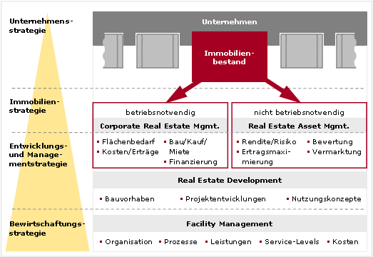 Weil Immobilien in direkter Wechselwirkung zum Unternehmenszweck stehen und mithin direkten Einfluss auf den Unternehmenserfolg haben, ist eine Einbindung in den Strategieprozess unerlässlich. Die systematische Planung aller immobilienbezogenen Unternehmensaktivitäten und ein regelmäßiger Abgleich mit der Unternehmensstrategie gewährleisten die optimale Nutzung aller Potenziale betrieblich genutzter Immobilien. Die besondere Herausforderung besteht darin, meist langfristige Immobilienentscheidungen mit einer Unternehmensstrategie zu verknüpfen, die sich flexibel einem sich rasch verändernden Umfeld anpassen muss.